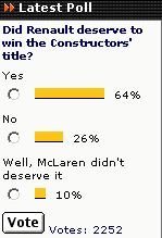 Hace un par de días ví una encuesta que comenzaba en planetf1. El objetivo era preguntar a los lectores si creían que Renault merecía haber ganado el campeonato de marcas o no. La he seguido y los resultados no me suenan mucho, porque no hace ni tres semanas era mayoría quién opinaba que el título era legítimo para McLaren. Cómo son las cosas, a temporada terminada, las encuestas están a favor del por mayoría aplastante.