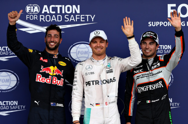 Nico Rosberg suma una nueva pole position esta temporada por delante de Sergio Pérez que ha conseguido una espectacular vuelta con el Force India. El mexicano acarrea una sanción de cinco posiciones en parrilla por cambiar su caja de cambios tras un fuerte accidente en la tercera sesión de entrenamientos libres, así que no podrá disfrutar de su primera línea de parrilla. Su lugar lo ocupará Daniel Ricciardo que ha calificado tercero, posición en la que partirá Sebastian Vettel.