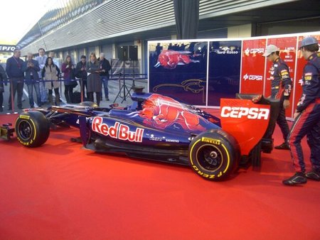 Tercera presentación del día, la del Toro Rosso STR7. El nuevo monoplaza de la escudería de Faenza ha sido presentado al mundillo de la Fórmula 1 en el circuito de Jerez, de la mano de los nuevos pilotos del equipo; Daniel Ricciardo y Jean-Eric Vergné. Los dos jóvenes han sido los encargados de destapar el coche, cubierto por una sábana roja con los logos de Cepsa.