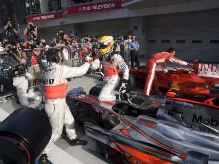 Lewis Hamilton tenía muy claro que los Ferrari eran superiores en Fuji, y su única opción pasaba por sacarse una vuelta estratosférica de la manga para robarles la pole position. Y eso es precisamente lo que hizo. La alegría en McLaren así parece indicarlo, y que el propio Hamilton la haya calificado como "una de mis mejores vueltas" parece bastante premonitorio.