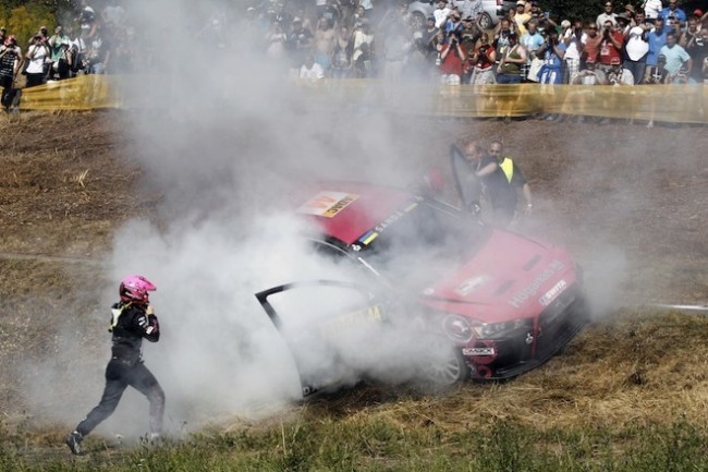 La piloto escandinava se salía recta en una curva de 90º. Sin ninguna consecuencia lograba dar marcha atrás, pero en la maniobra se salía a un pequeño campo. La vegetación ya seca se prendía fuego por las altas temperaturas del escape y de nuevo provocaba unos momentos de tensión de los que sin duda les costará recuperarse tanto a piloto como a copiloto.