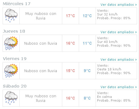 Pero si dos días de lluvia se antojan como algo malo, que se lo digan a Force India, Red Bull y Virgin Racing, mucho peor será para todos si se confirman los malos augurios y durante los cuatro días de test de esta misma semana vuelve a llover. De los cuatro días, el miércoles y el sábado son en los que hay menor probabilidad de precipitación, un 85%. El jueves y viernes, la probabilidad sube hasta el 90%. Vamos que puede llover todos los días.