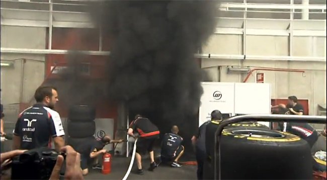 La rápida actuación del equipo y de trabajadores de otros equipos vecinos, que utilizaron todos los extintores disponibles para hacer frente al fuego, ha evitado daños mayores. Los bomberos han terminado sofocando el fuego, que al parecer se había originado en la parte trasera del box, donde se almacena el combustible, lubricantes… Podéis ver un vídeo del suceso a continuación.