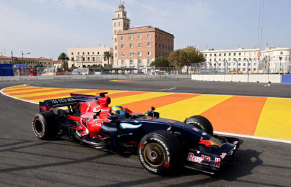 La Fórmula Uno ya es una realidad en el Valencia Street Circuit. Esta mañana ya se ha celebrado la primera sesión de entrenamientos libres del GP de Europa en la que sorprendentemente el mejor tiempo ha sido para el piloto alemán de Toro Rosso, Sebastian Vettel con un tiempo de 1'40''496. Vettel le ha arrebatado la primera posición a Felipe Massa en los últimos instantes de la sesión.