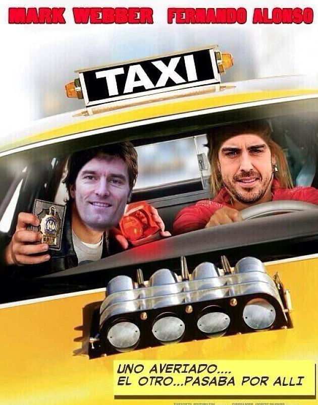 Recordamos que tres reprimendas equivale a perder 10 posiciones en la parrilla del siguiente gran premio, que es exactamente lo que le ocurrirá a Mark Webber. El español era sancionado por detenerse en medio de la pista, una acción calificada como de peligrosa (Lewis Hamilton estuvo a punto de llevárselo puesto) mientras que Webber es reprendido por salir a pista sin el permiso de los comisarios. Tras la sanción, el propio Fernando Alonso se lo ha tomado con algo de guasa publicando la foto que encabeza este post. Un "chop" que utiliza como base el cartel de la película Taxi (versión americana) con el mismo como Queen Latifah y Mark Webber haciendo de Jimmy Fallon.