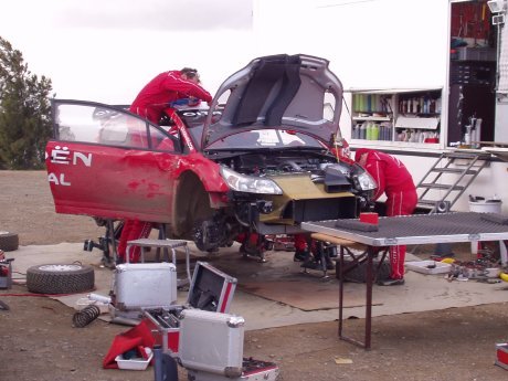 y dejaba el C4 bastante tocado, justo el día que Sordo llegaba para continuar las pruebas, así que los mecánicos se tuvieron que emplear a fondo y darnos a todos los presentes una lección de cómo se repara un WRC en poco tiempo, así como demostrar que en estos Test no se deja nada a la improvisación, tenían repuesto de todo, ¡hasta la pegatina de Citroën del cristal delantero! , ya que después del toque de Loeb, tuvieron que poner de nuevo la luna delantera, y no contentos con colocarle la pegatina se le fijaron ¡con un secador!.