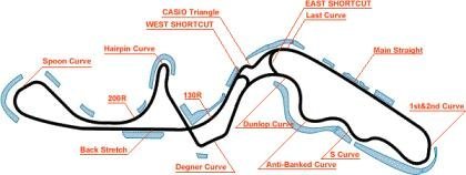 Cualquiera de sus secciones tiene mucha variedad. La sección inicial cuenta con dos curvas enlazadas a derechas (curvas 1ª y 2ª) en las que se entra a gran velocidad y que dan paso a las famosas Curvas-S. Dejando atrás éstas, tenemos la curva Dunlop, a izquierdas y prácticamente ciega que nos deja rápidamente en una curva cerrada a derechas que da al túnel. Este túnel hace que el circuito adopte una forma de ocho poco habitual. Una exigente horquilla a izquierdas nos lanza a la “recta” más larga del circuito, que termina en la espectacular 130R, a izquierdas. Como guinda final, la chicane de entrada a meta es un punto fenomenal para intentar adelantar, eso sí, sin salirse de la pista…