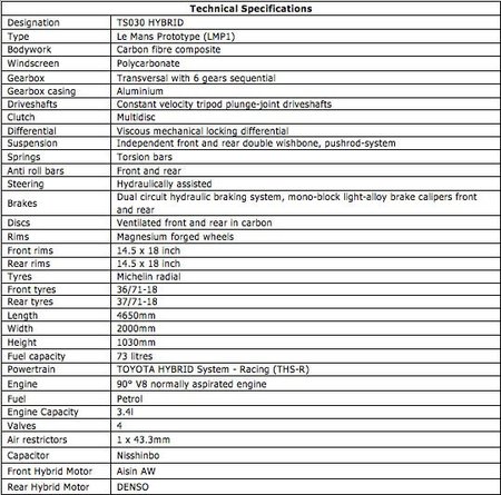 Las características del nuevo Toyota TS030 Hybrid también han sido desveladas. El LMP1 estará propulsado por la evolución del propulsor RV8KLM de 3.4 litros, de gasolina (por si quedan dudas). Que no es el mismo que fue estrenado el pasado año por Rebellion Racing y procedente del Super GT.