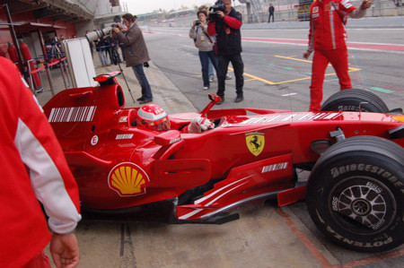 Y el alemán, ajeno a todo esto, ha sorprendido a propios y extraños al llevarse el mejor tiempo de la jornada después de un año sin comprobar la exquisita aceleración de los Fórmula 1. Michael ha dado un total de 64 vueltas, suficientes para aventajar al final del día por 207 milésimas al Ferrari de Luca Badoer. Además, ha sido el único capaz de rodar por debajo del 1:22. ¿Pero qué hace este tío lejos de un Fórmula 1? Ojo, he visto que tanto el Marca como la web oficial del Circuit apuntan a que Michael tenía el control de tracción habilitado, aunque si realmente es así, no acabo de verle el sentido al test de hoy.