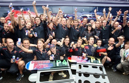 El equipo que veis en la foto, Toro Rosso, hace apenas 3 años era todavía la siempre querida Minardi, y seguro que muchos de los que aparecen en ella estaban también hace 3 años. ¡Quién nos iba a decir que veríamos algún día un heredero de Minardi marcar la pole de un Gran Premio! Seguramente nadie, y seguramente poco quede en esta Toro Rosso de aquella Minardi, pero no pude dejar de acordarme de la simpática escudería italiana cuando Vettel marcó esta mágica pole.