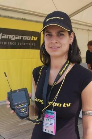 Bien, ya os hemos hablado en posts anteriores acerca del nuevo artilugio que se está adentrando en las carreras en vivo del Mundial de Fórmula 1. Se trata de una pequeña pantalla de TV provista de teclado para navegar por sus funciones. El Kangaroo TV está causando verdadero furor entre los aficionados que acuden al circuito a ver las carreras en vivo, y durante estos dos días que llevamos de Gran Premio los dos stands que esta compañía ha instalado en Montmeló no han parado de recibir visitas de curiosos que querían ver y tocar con sus propias manos este nuevo y seductor invento. Y cómo no, yo tenía muchas ganas de hacerlo, uno de esos curiosos he sido yo mismo.