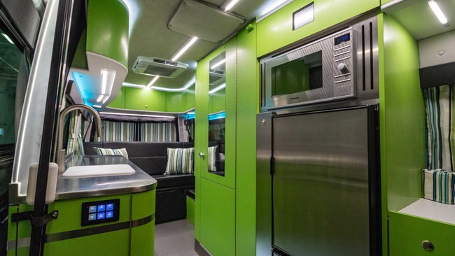 Vestida de verde lima, la Advaced RV Baja cuenta con un centro de mando digital Silverleaf a través del cual se puede controlar la mayoría de dispositivos, además de poder consultar la información acerca del nivel de aguas grises y negras, de la batería, la temperatura o el estado del tanque de agua del vehículo.