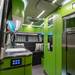 Advanced RV ha añadido superficies de acero inoxidable para compensar los muebles y armarios verdes huyendo de los acabados en madera, así como una combinación de mesa comedor extensible que se convierte en un mostrador en forma de L con cabida para dos personas. Y también cuenta con iluminación ambiental.