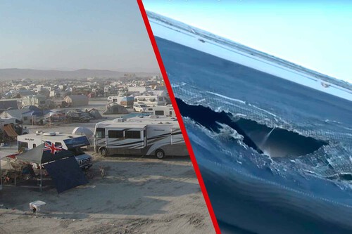 Daños en un festival huracanado. Burning Man no es precisamente buen lugar para los vehículos camper, que sufren por la arena y el polvo. Pero la última edición además estuvo marcada por fuertes tormentas de arena y vientos huracanados que obligaron a suspender una jornada del festival y destrozaron tiendas de campaña y dañaron no pocas camper. La autocaravana de esta pareja no se salvó: el viento rasgó el toldo exterior, la escalera del techo se arrancó de los soportes y algunas molduras terminaron deformadas.