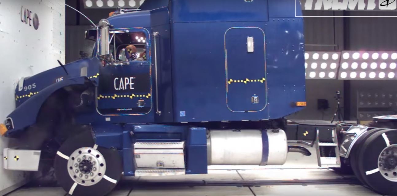 En el caso del camión se trata de un modelo con morro, de los que por Europa vemos pocos circulando, el que se enfrenta a una prueba de impacto frontal contra un muro sin deformación. Fíjate cómo el capó invade cabina... Se ponen los pelos como escarpias.