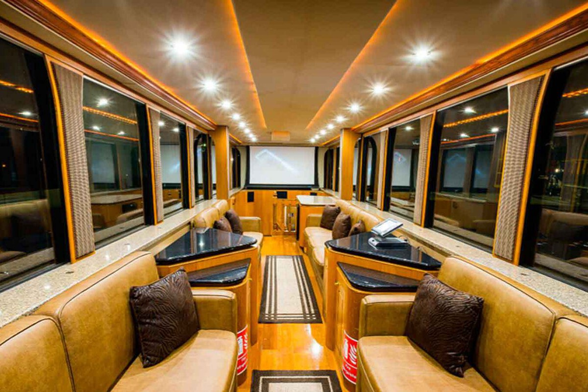 Cuero, granito y una ducha más cara que un Ibiza. El equipamiento interior no se queda a la zaga. En total tiene 14 televisiones además de la pantalla de cine desplegable de 100 pulgadas acompañada de un proyector de techo. Solo el cuero que reviste sus muebles tiene un valor de 30.000 dólares (26.000 euros al cambio actual), mientras que sus muchas encimeras de granito, además de la de la inmensa cocina, están valoradas en 100.000 dólares (cerca de 86.700 euros).