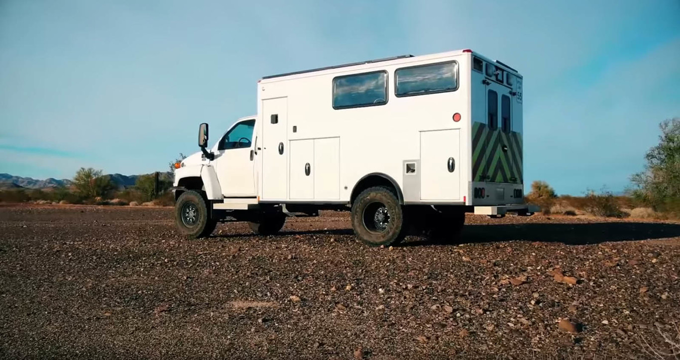 La base es un Chevrolet C4500 medium-duty truck, con motor diésel Duramax de 6.6 litros y tracción integral para llegar a sitios realmente remotos. Tom escogió también esta base para no correr el riesgo de superar el límite de peso de una furgoneta tipo Sprinter. Con este camión, el peso no sería un problema.
