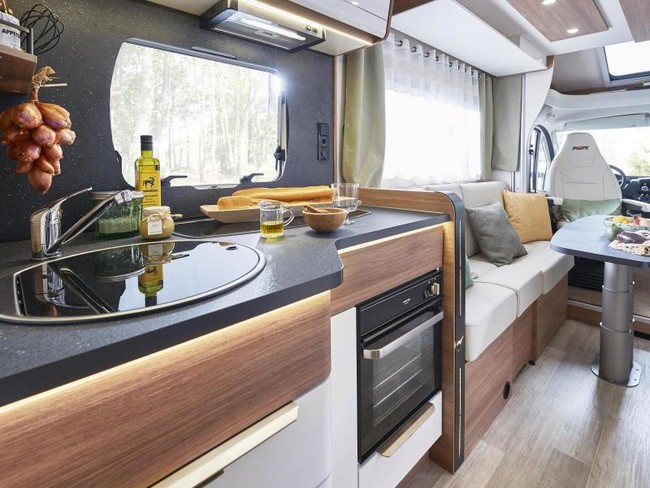 Con una longitud de 6,9 metros y un peso de 3,5 toneladas, la Pilote P696D se ha basado en la Fiat Ducato. La parte delantera del vehículo se ha dedicado a una cama basculante de 160x200 cm que se puede bajar a la altura de los asientos para hacer más fácil el acceso, aunque puede quedar suspendida a una altura superior para instalar una segunda cama de matrimonio usando los asientos del salón.