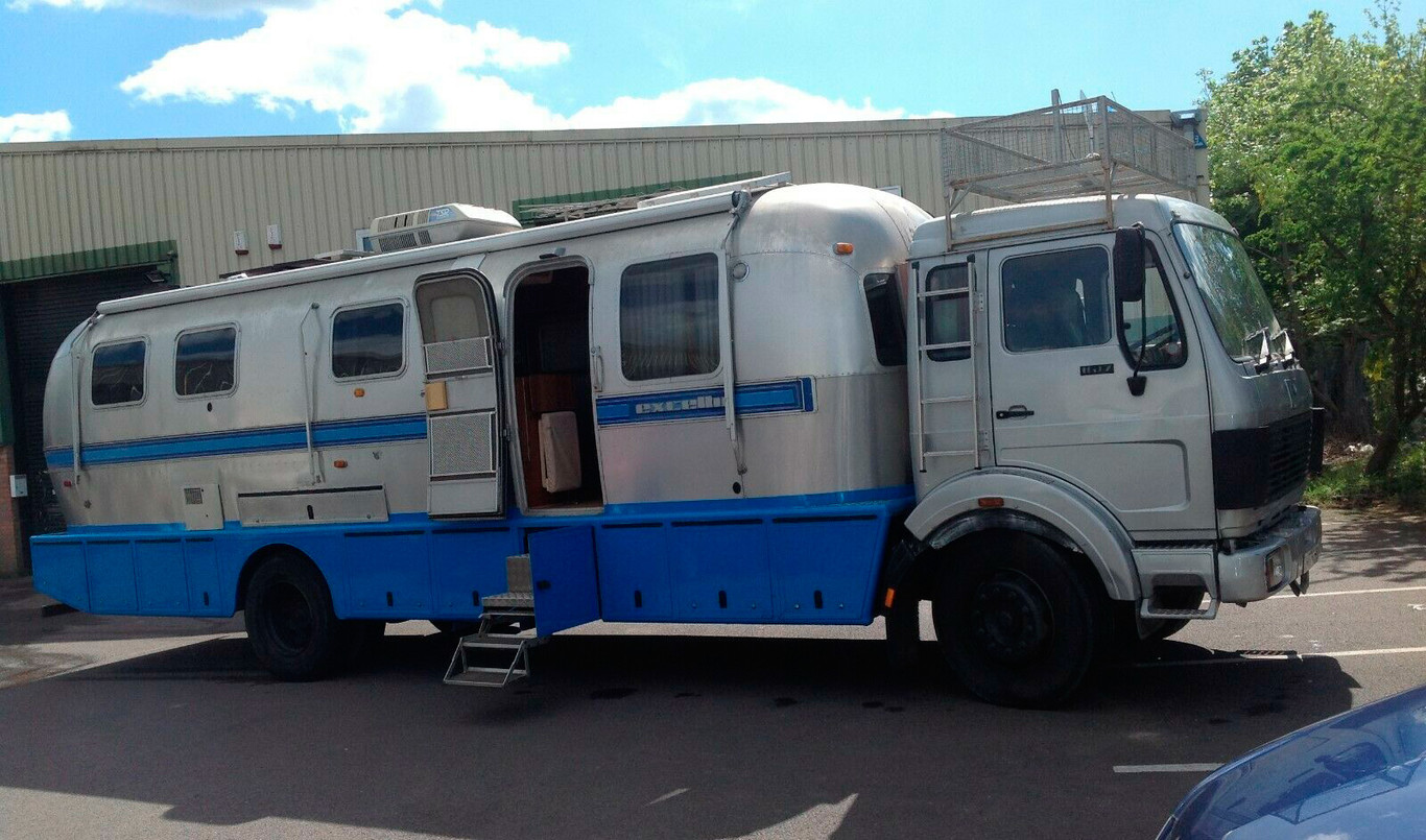 Se trata de un camión Mercedes-Benz 1617 en cuyo remolque se ha integrado una caravana Airstream Excella de 1985 que, pese a ser antigua, está en buen estado y dispone de todas las comodidades que se le exigen a estas casas en miniatura motorizadas. Y en su caso va a esta equipada con paneles solares y un generador eólico para surtir de energía eléctrica a sus sistemas.