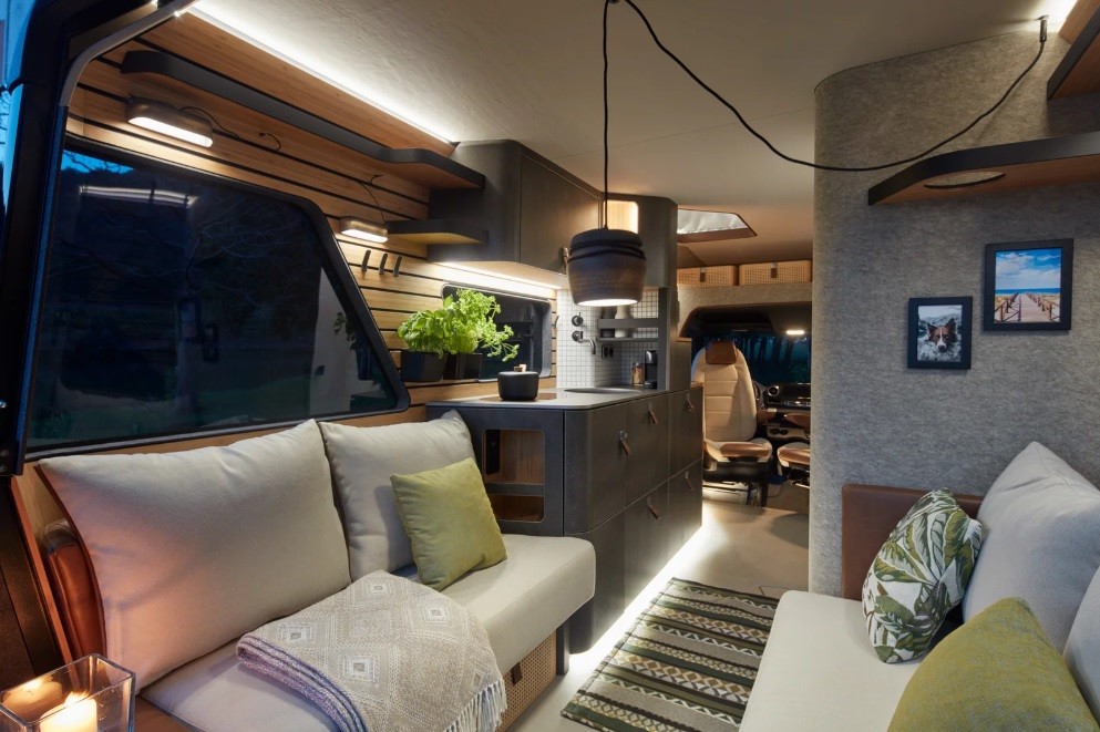 Por su parte, el dormitorio está equipado con iluminación ambiental y se puede abrir en la parte trasera para dar acceso una 'terraza'. Además, la cubierta del techo está equipada con un sistema de paneles fotovoltaicos para mejorar la autosuficiencia en la carretera.
