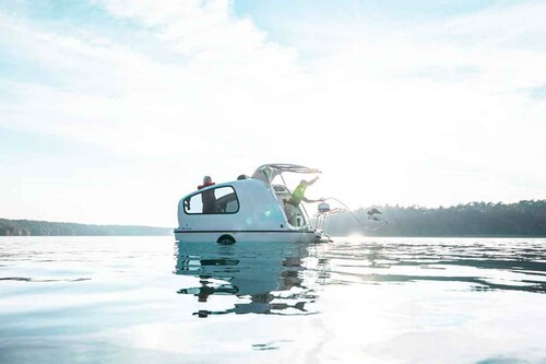 Sí, navegar. Por tierra es una pequeña caravana, pero también puedes botarla en un embarcadero y echarla al agua ya que se convierte en bote. Cuesta menos de 40.000 euros: no es que sea barata, pero es un estupendo 2 en 1.
