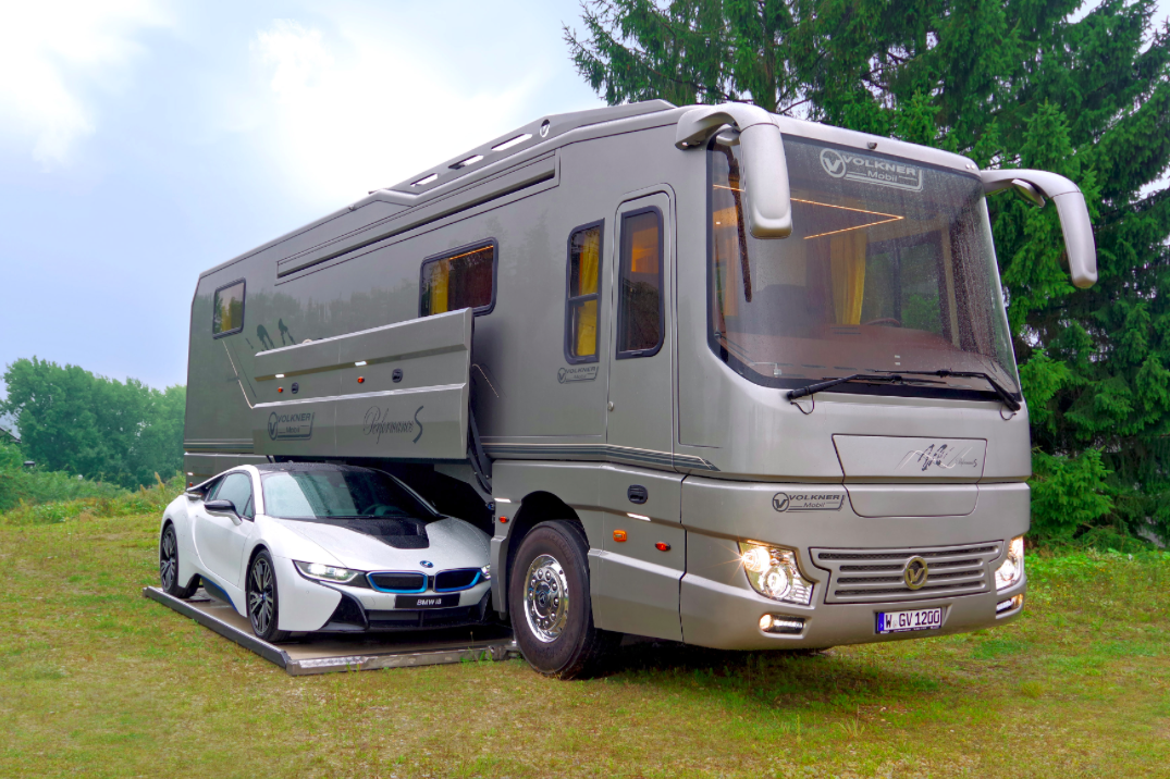 Se trata de una autocaravana de 12 metros de largo que además de las comodidades habituales de un vehículo de este segmento, también cuenta con un garaje a medida para llevar el coche dentro.