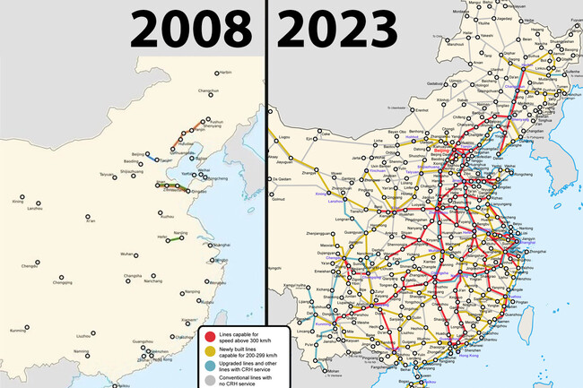Mientras tanto, en China van a otra velocidad, nunca mejor dicho. Solo hay que ver lo que ha crecido su infraestructura ferroviaria de alta velocidad entre 2008 y 2020. En 2008 no llegaba a los 3.000 kilómetros y ahora supera los 42.000 kilómetros. España cuenta con 3.966 kilómetros de red Adif de alta velocidad.