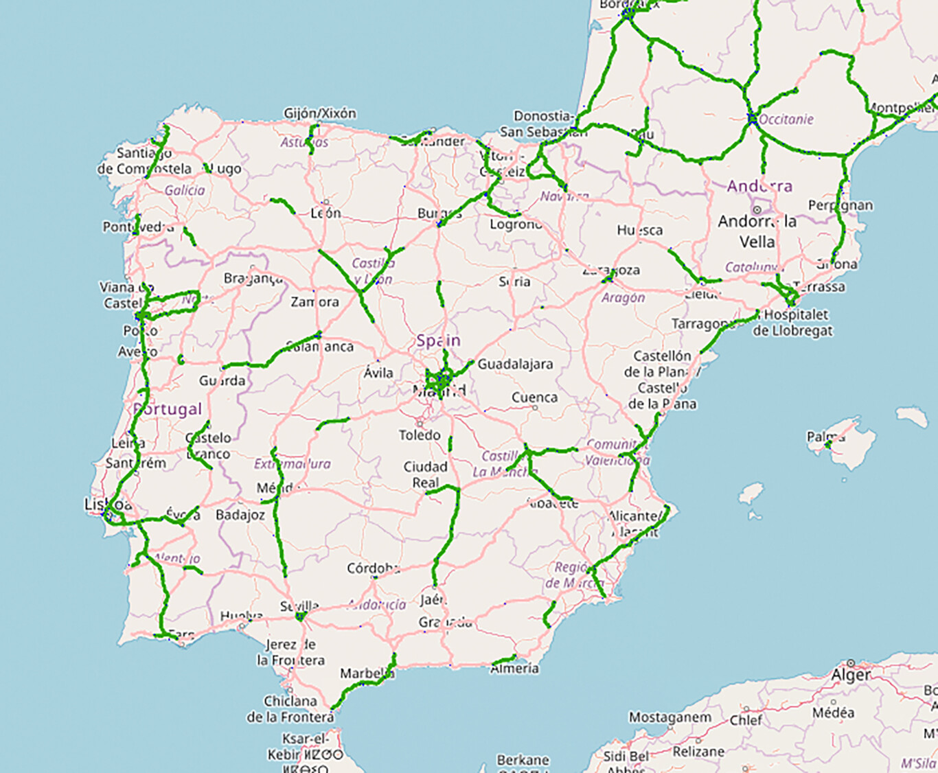 Las cifras no siempre nos dicen mucho. Sin embargo, viéndolo en el mapa queda mucho más claro. En verde, los grandes ejes donde hay suficientes cargadores rápidos. Y en rosa, donde faltan. Eso significa que en España no hay cargadores suficientes como para unir la mayoría de los grandes núcleos de población entre sí de forma holgada.