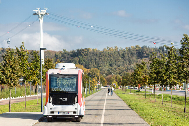 El servicio ha estado funcionando entre la entrada principal y el estacionamiento remoto, en una ruta de tráfico de 600 m, compartida con bicicletas, peatones, coches y autobuses desde marzo. Pasará a ser totalmente autónomo en los próximos meses.