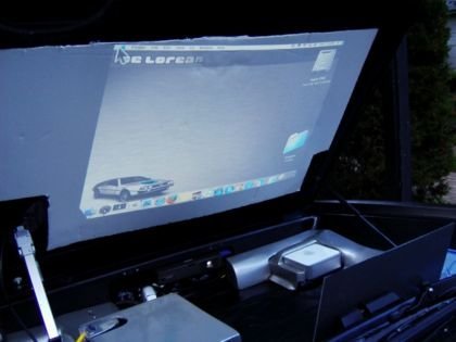 Si al fenómeno de instalar estaciones multimedia con PC’s o Mac’s en un coche lo llamamos carputer, a montarte un proyector para hacer del capó una pantalla de 37’’ como lo llamamos, *¿CapóTV?* El invento en sí, útil no es, porque aunque te instalases el mejor GPS en el Mac Mini sería bastante difícil conducir así por la calle, pero si el coche ya es vacilón, con eso serás el alma de la fiesta, de eso no hay duda…
