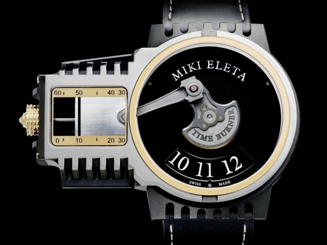Se trata de un reloj de pulsera suizo (había muchas posibilidades de que viniese de allí ¿no?) firmado por Timeburner y diseñado por Miki Eleta que simula el funcionamiento de un motor de combustión interna. Dentro de la esfera encontramos un cigüeñal que marca las horas y a la izquierda, en una prolongación (el cilindro) un pistón sube y baja marcando los minutos. Por cierto, la corona hace las veces de bujía.