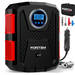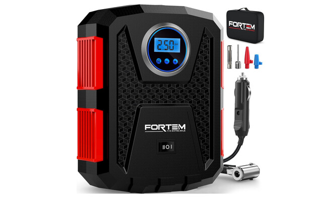 FORTEM Inflador de Ruedas de Coche, Compresor de Aire - Compresor de Aire Portátil para Ruedas de 12 V con Luz LED - Manómetro Digital, Autobombeo, Parada Automática - Bolsa de Transporte (Rojo)
