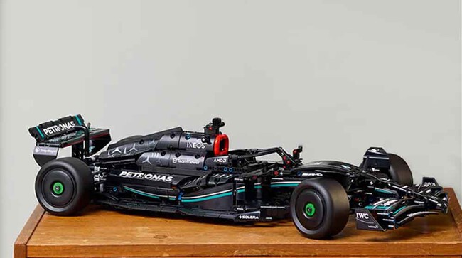 Más allá de imitar su escultural impronta, incluyendo los adhesivos publicitarios del monoplaza de Lewis Hamilton y George Russell, goza de varias partes funcionales como es habitual en los LEGO Technic.