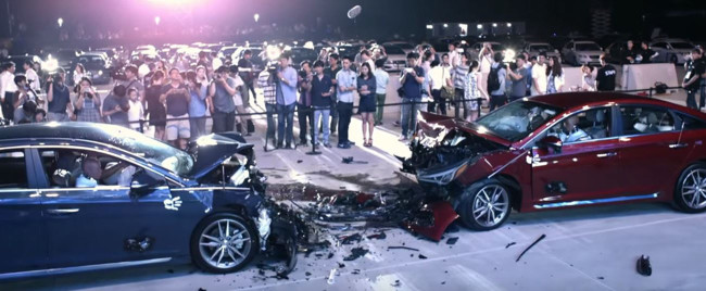Hyundai es acusada de que sus coches para el mercado interno (Corea) son más inseguros que los que se fabrican para el resto del mundo. Y la respuesta es un auténtico espectáculo repleto de público en el que enfrentan en un crash-test dos Sonata, uno coreano y otro extranjero, para demostrar que son igual de seguros.