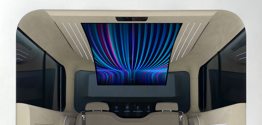 La firma surcoreana fantasea con un habitáculo en el que la descomunal pantalla flexible se apodere del techo para que dos personas "disfruten de contenidos simultáneamente". El sonido se reproduciría a través de altavoces integrados en los reposacabezas de los asientos.