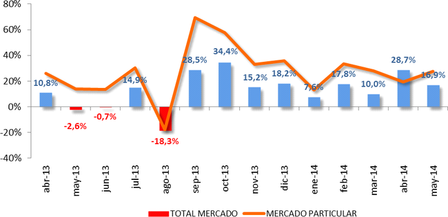 Continua el optimismo en el mercado español por otro buen resultado de ventas, un 16,9% de incremento sobre mayo de 2013, u 82.483 unidades frente a 70.546. En lo que va de año el mercado ha pasado de 313.588 unidades (2013) a 364.784 unidades, un crecimiento del 16,3%, el mayor de la Unión Europea.