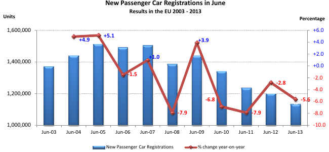 Junio de 2013 ha sido el peor junio de los últimos 10 años en Europa, en 2003 se había matriculado casi el triple de turismos y todoterrenos. Respecto a grupos de marcas, solo hay números positivos en el semestre en Daimler (+2,1%), Kia (+1,2%), Honda (+6,4%), Jaguar Land Rover (+11,2%) y Mazda (+3,2%).