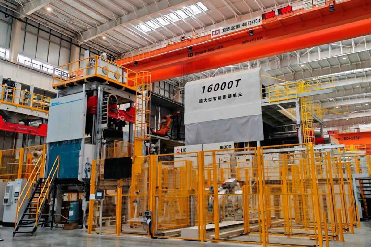 600.000 piezas anuales. En esta factoría de 47.000 m², y con una inversión de 1.000 millones de yuanes (unos 122 millones de euros al cambio), trabajan dos mega prensas: esta que se emplea a 16.000 toneladas y otra que hace lo propio a 10.000 toneladas. Esta última produce bandejas y carcasas asimismo en 2 minutos, inyectando aluminio fundido a 720 °C en el molde. El objetivo es que produzcan las carcasas de batería en serie desde abril.