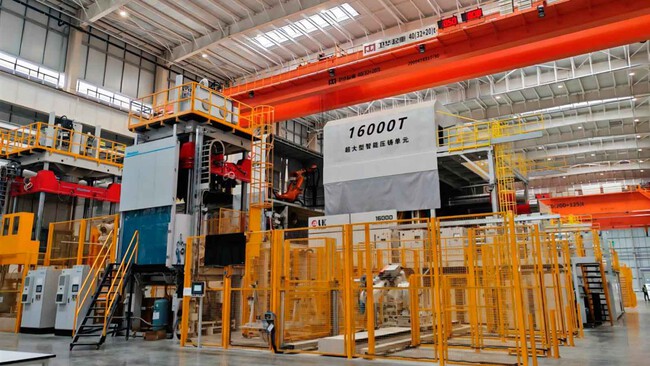 600.000 piezas anuales. En esta factoría de 47.000 m², y con una inversión de 1.000 millones de yuanes (unos 122 millones de euros al cambio), trabajan dos mega prensas: esta que se emplea a 16.000 toneladas y otra que hace lo propio a 10.000 toneladas. Esta última produce bandejas y carcasas asimismo en 2 minutos, inyectando aluminio fundido a 720 °C en el molde. El objetivo es que produzcan las carcasas de batería en serie desde abril.
