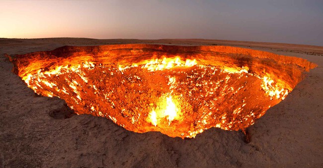 Lo llaman la 'Puerta del Infierno' y está en Turkmenistán. Se trata del inmenso cráter de Darvaza y lleva 54 años ardiendo. Nació tras el derrumbe de una cámara de gas natural: los soviéticos pensaron que prendiéndole fuego, neutralizarían sus emisiones, y que se pagaría rápidamente. No fue así.