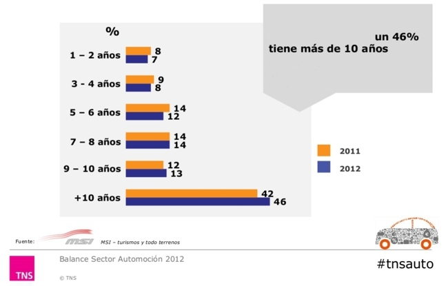 De los aproximadamente 21,5 millones de coches (turismos) que hay en España, el 46% tiene más de diez años, según datos de TNS (Indicar). No menos importante que la cifra en sí es el hecho de que ha subido bastante del 2011 al 2012: el año pasado era el 42%. Una de las principales consecuencias de un parque automovilístico viejo es la contaminación del aire.