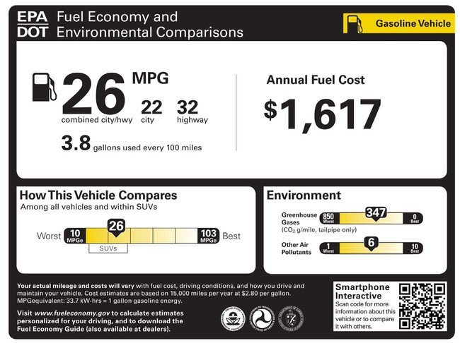 Actualmente tienen unas pegatinas que informan del consumo del coche (en millas por galón) en zona urbana y en autovía, el coste estimado en combustible (15.000 millas al año y 2,80 dólares/galón) y poniendolo en contexto con otros vehículos del mismo tipo. En Europa los fabricantes dan más información.