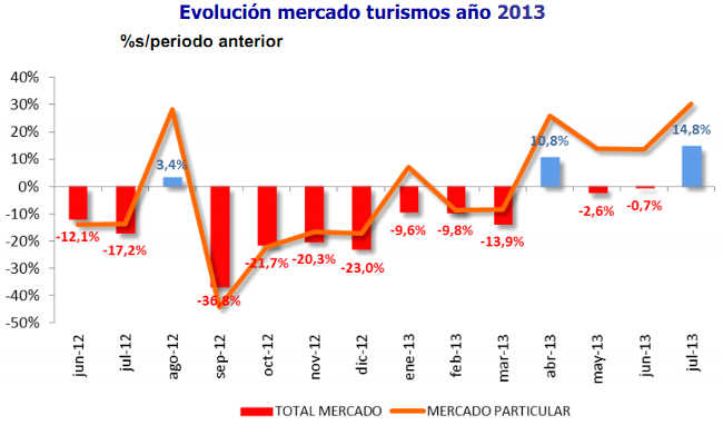 En julio de 2013 se han matriculado 75.024 unidades, situando la cifra de ventas de los siete primeros meses del año en 461.382 turismos. El canal de particulares ha sido el gran protagonista con un crecimiento del 30,4%, que en estos momentos representa ya prácticamente el 50% del mercado total.