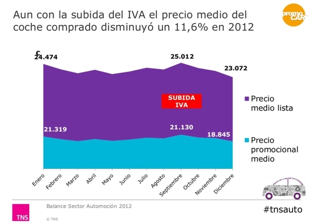 Según datos de TNS (Promocar) el precio medio final de los coches nuevos en España bajó un 11,6% en 2012, y eso incluso después de que en septiembre subiera el IVA tres puntos hasta el 21%. Este precio final se refiere al precio real después de descuentos y promociones que el cliente tiene que pagar por el coche que compra.