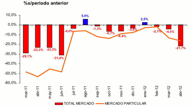 En los últimos 12 meses, solo hubo dos en los que hubo un aumento de matriculaciones respecto al año anterior. La caída de abril es la más grande desde julio de 2011, así que las teorías de los brotes verdes en el sector han quedado descartadas, aún puede caer el mercado más, y nadie sabe hasta qué punto.