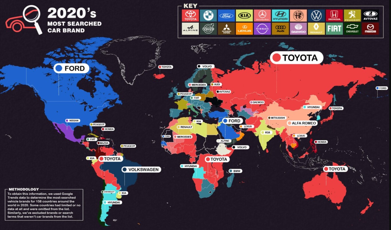 El mapa muestra cómo Toyota ha ganado terreno en 2020, siendo la marca más buscada. La firma nipona encabezó las búsquedas en alrededor de un tercio (34,8 %) de todos los países analizados; su aumento de popularidad en 2020 se debió en parte a la caída de interés de búsqueda de BMW en muchos países.