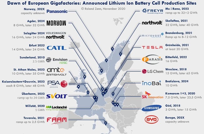 Un mapa elaborado por el químico y experto en baterías Roland Zenn muestra que al menos 20 gigafactorías han anunciado planes para producir 430 GWh de celdas de baterías entre 2021 y 2024, lo que equiparía cerca de siete millones de coches eléctricos.