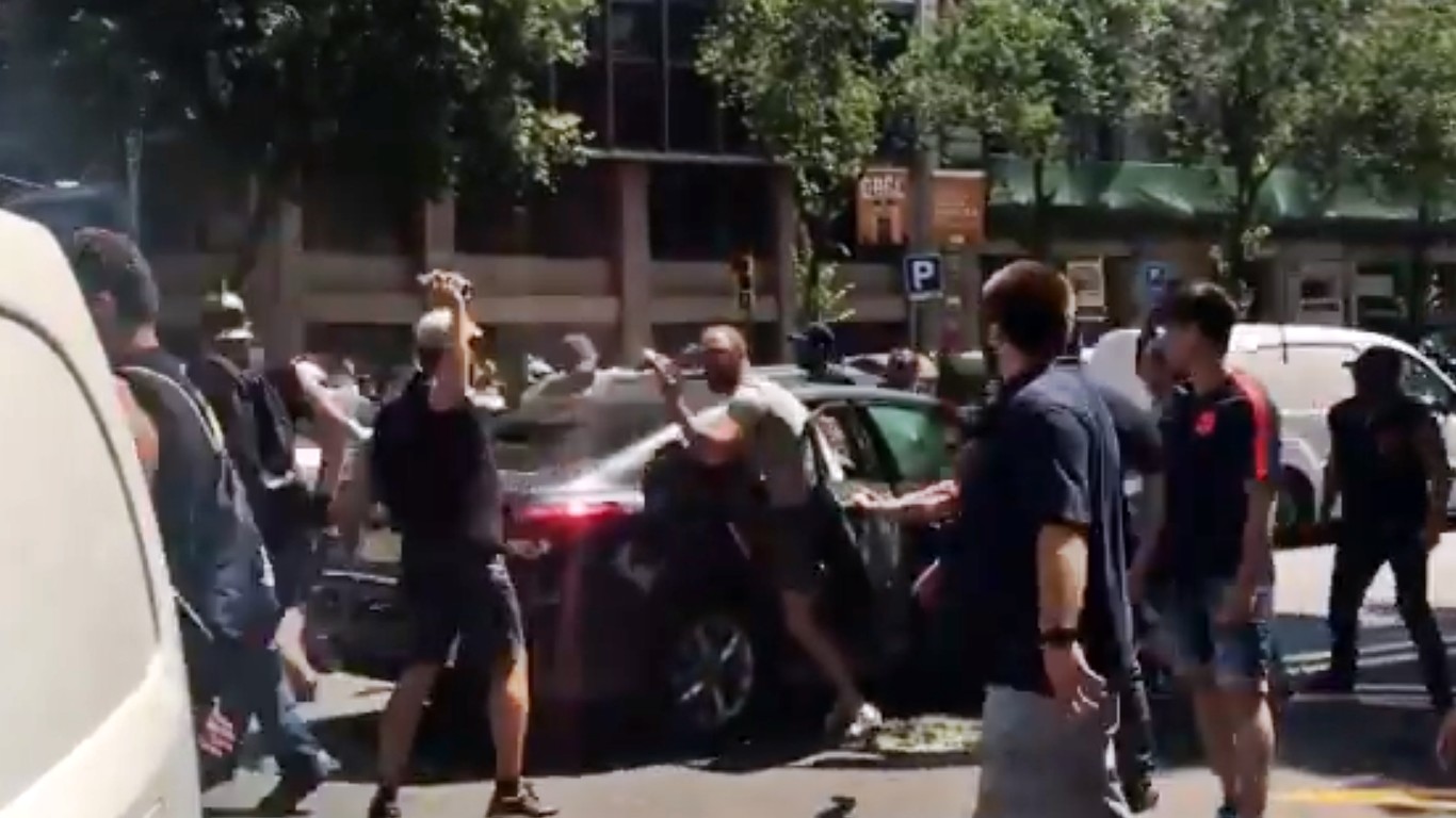 El episodio de máxima tensión se vivió ayer por la tarde en la calle Aragón y fue captado por Carlos Márquez (periodista de El Periódico que estaba siguiendo la manifestación) cuando un grupo de manifestantes rodearon a un Hyundai i40, un VTC en servicio, y comenzaron a golpearlo, zarandearlo, pintarlo y lanzar objetos contra los cristales.