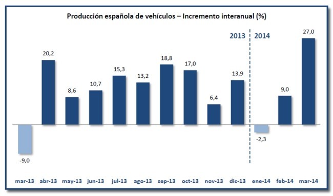 En marzo se fabricaron en España 220.435 vehículos, y entre enero, febrero y marzo de 2014 se han fabricado en total 618.478 automóviles, de los cuales 466.041 son turismos, según datos de la asociación española de fabricantes de automóviles y camiones ANFAC.
