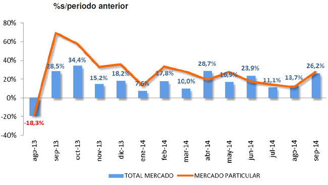 Hablamos de 57.010 unidades vendidas en el pasado mes, con un total acumulado durante 2014 de 640.673 unidades (un incremento del 17,2 % sobre el mismo periodo de 2013). El objetivo para este año es de 850.000 unidades, aunque eso deja a España por debajo de sus números teóricos, calculados en función de los niveles de renta per cápita y desarrollo económico, que son 1,2 millones.